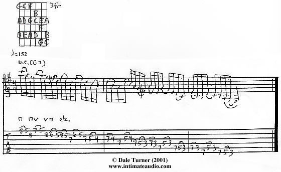 Legato Pattern #4: This last one is similar to a common diatonic 3rds pattern, varied only in that a descending scalar step is used to precede each ascending 3rde.g. (in analysis of the opening six notes), C (down a scalar step to:) B (up a minor 3rd to:) D (down a scalar step to:) C (up a major 3rd to:) E (down a scalar step to:) D, etc. THE PICKING: Once again, to add more edge to the legato sound, more picking is addeddespite the fact that, when four notes are played in succession along the same string, a single pick could be used. Experiment with both approachesblending in more picking, or playing thew passage purely legato (with as little picking as possible)till you find the approach that best suits you. (*You can hear the lick FAST by clicking HERE*) (*You can hear the lick SLOW by clicking HERE*)