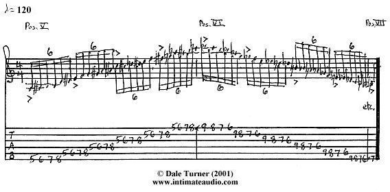 Okay. In this Psychotic Lix installment, I'm going to present a couple four-notes-per-string exercises for the purpose of focusing on pickhand/fretting hand synchronization: (1) a brainless TV exercise (meaning you can let your fingers do the walking while disengaging your brain) played in position, using all four fret-hand fingers in a 1-2-3-4 arrangement, and (2) a standard chromatic scale (successive half steps), played using the same 1-2-3-4 fingering pattern with position shifts. These pickhand/fretting hand synchronization exercises will be presented in two ways: (1) grouped in 16th notes (four evenly-spaced notes per beat) and (2) 16th-note triplets (six evenly-spaced notes per beat). Since these examples are based on four-notes-per-string patterns, accenting every four notes (playing slightly louder on beats one, two, three, and four) couldn't be more convenient, since it coincides with the instance you switch to the next higher/lower adjacent string. The real challenge for your pickand comes in trying to accent every six notes (again: playing slightly louder on beats one, two, three, and four). This will make it necessary to mask, if you will, the change between stringsin short, make every effort to not draw attention to the fact that you're playing four notes on each string. This is WAY more difficult than it seemsso TRY IT!!!! If this doesn't make sense, to get a clear picture of what's happening here, listen to the MP3s below. For maximum fret-hand efficiency, strive to position your digits/hand as such: Keep your fret-hand's wrist and forearm straight and relaxed. Try keeping the palm of your fret-hand parallel and almost touching the guitar neck's binding. Fret each note firmly behind the indicated fret, pressing straight down using your fingertips. Each of your fret-hand fingers should line up parallel to each fret. When a finger is not fretting a note, keep it hovering as close to the fretboard as possible. When ascending, keep fingers depressed after a note is fretted, removing them at the last possible moment to avoid excess motion. When descending, try to finger all the notes that occur along that string in advance. The key to pickhand/fretting hand synchronization is to make sure that each of your fret-hand's fingers travel the same distance when engaged in fretting a note, or releasing a note. This is of utmost importance because your pick will obviously be striking the string at the exact same rate, regardless of which finger is being depressed. If there is any variation in the amount of time it takes for a particular fret-hand finger to make it to a string, your left and right hands will be out of sync, and breakdown will occur. If you are unable to hear this in your own playing (read: you think you play fast and clean, but your teacher says you don'tand you don't believe them!), if you have a four-track recorder, record yourself at your machine's 2x setting (meaning the tape reels spin twice as fast). When you play the tape back (at regular speed), you'll hear your shreddin' licks at half speed. Talk about an ear opener! ***************************************** This first bugger originates at the 5th fret and involves a 1-2-3-4 fingering pattern (ascending). After all six strings are played in ascending fashion, the fret-hand's pinky is used to facilitate a position shift, then kicks of a 4-3-2-1 pattern (descending). To make this exercise more interesting, feel free to keep shifting the pattern up the neck, then back down (à la the various MP3s linked below). Make sure you accent (i.e., pick louder) every four notes. To get the hang of this, and to help draw a clear distinction between accented and unaccented notes, it may help to intentionally play the non-accented notes quieter than you're accustomed. What you want to strive for is the development of the ability to control your right hand in a manner that enables you to execute an accent whenever the spirit moves youan often overlooked area of pickhand control. Keep in mind this AIN'T a true chromatic scale. The only instances successive half steps occur in this exercise exist between the notes along each individual string; when skipping between strings, a whole step interval occurs (the only exception being strings 2-3). (*You can hear the lick FAST by clicking HERE*) (*You can hear the lick SLOW by clicking HERE*)